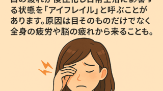 目の疲れが慢性化し日常生活に影響する状態を「アイフレイル」と呼ぶことがあります。原因は目そのものだけでなく全身の疲労や脳の疲れから来ることも。