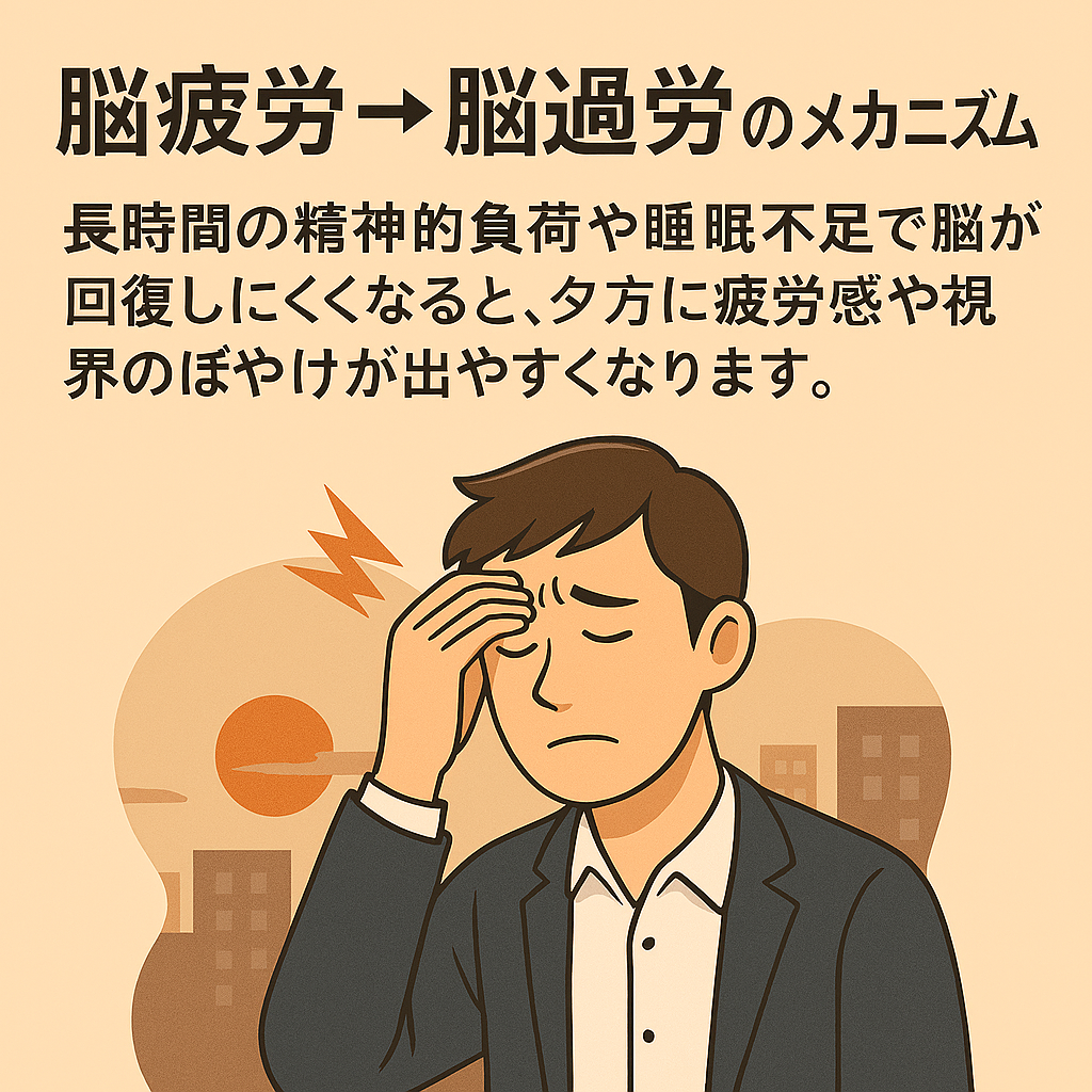 長時間の精神的負荷や睡眠不足で脳が回復しにくくなると、夕方に疲労感や視界のぼやけが出やすくなります。