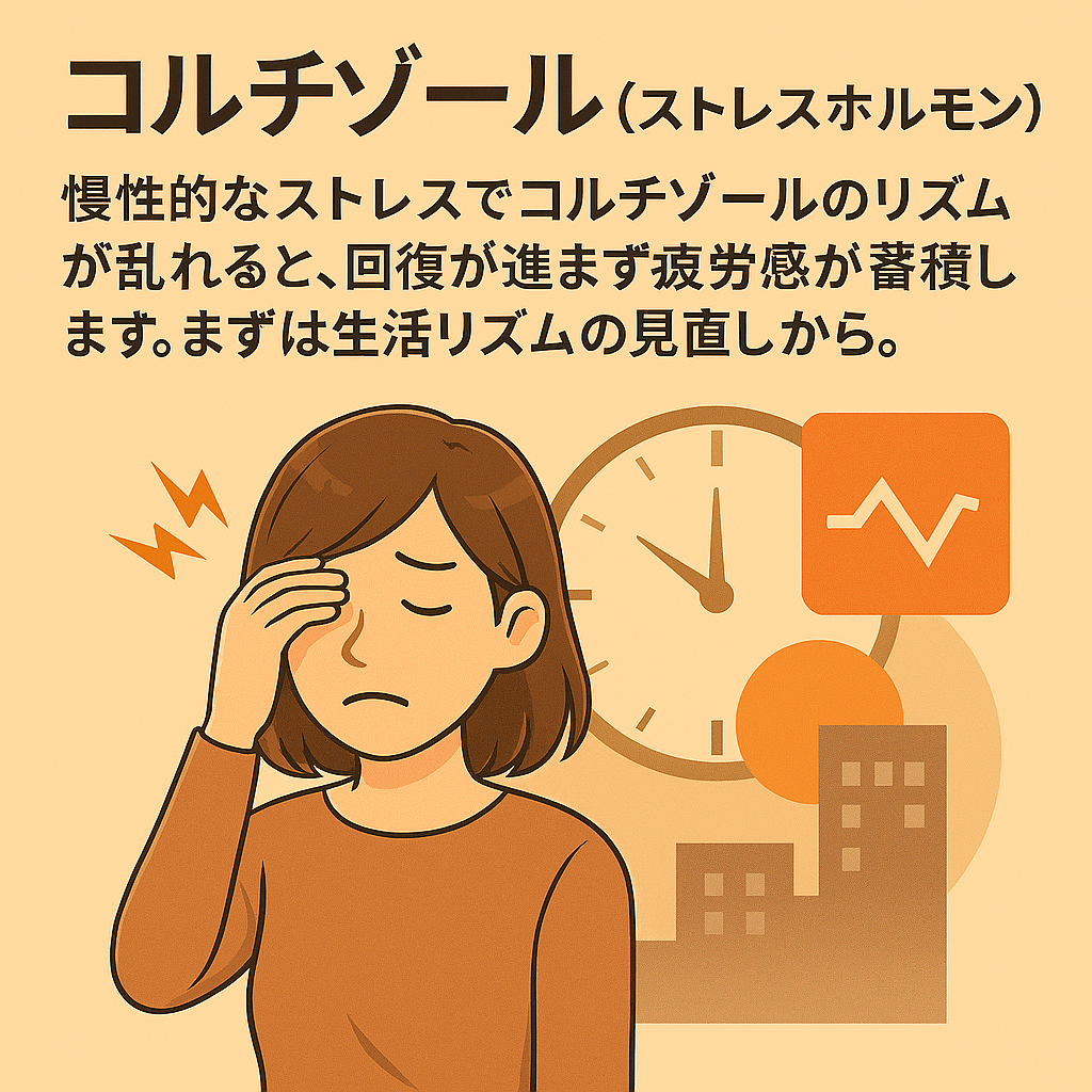 慢性的なストレスでコルチゾールのリズムが乱れると、回復が進まず疲労感が蓄積します。まずは生活リズムの見直しから。