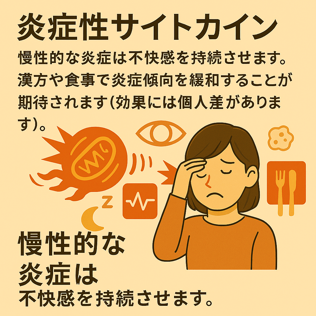 慢性的な炎症は不快感を持続させます。漢方や食事で炎症傾向を緩和することが期待されます(効果には個人差があります)。
