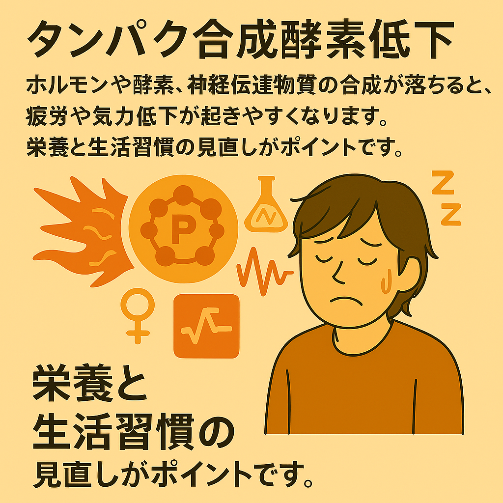ホルモンや酵素、神経伝達物質の合成が落ちると、疲労や気力低下が起きやすくなります。栄養と生活習慣の見直しがポイントです。
