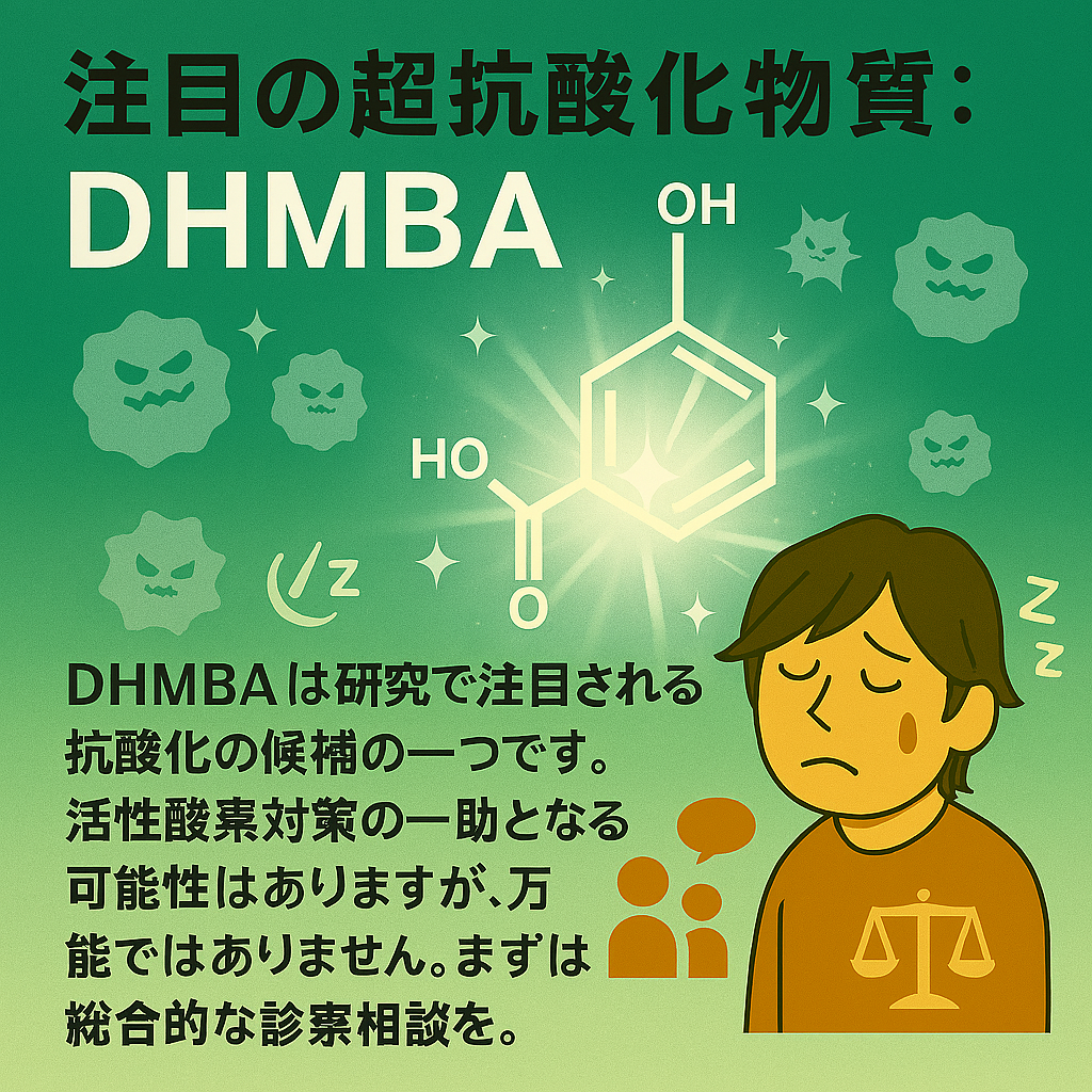 DHMBAは研究で注目される抗酸化の候補の一つです。活性酸素対策の一助となる可能性はありますが、万能ではありません。まずは総合的な診察相談を。