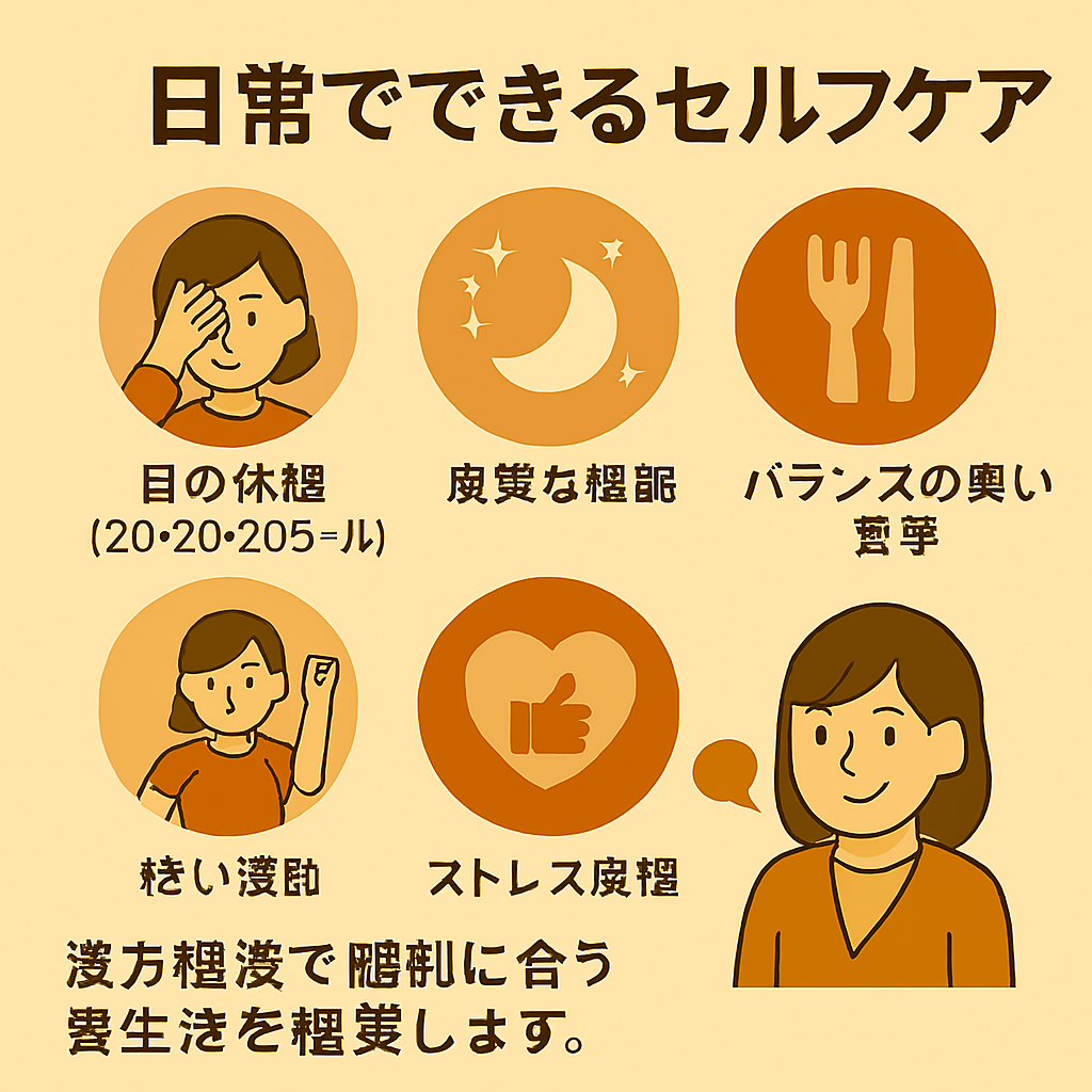 目の休憩、良質な睡眠、バランスの良い食事、軽い運動、ストレス管理。漢方相談で個別に合う養生法を提案します。