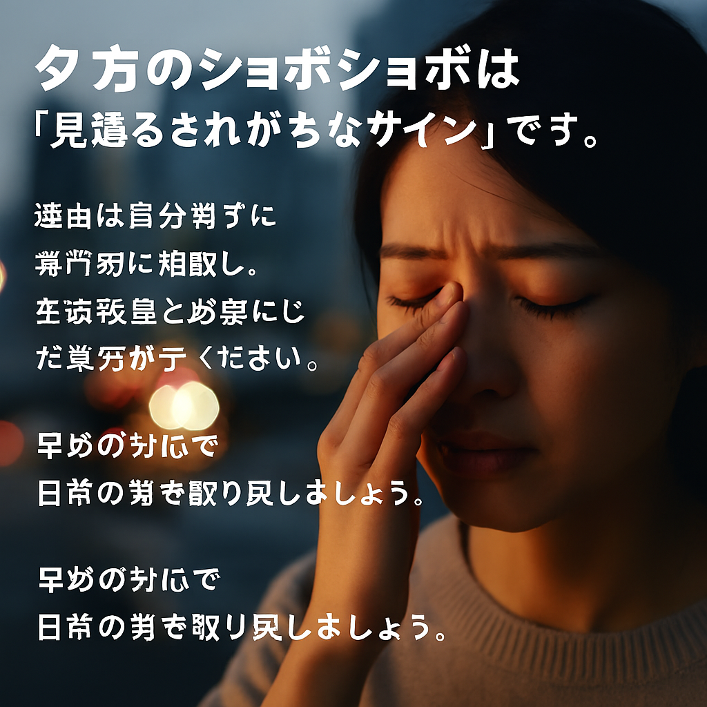 「そうそう、夕方だけ目がつらいんだよね」そんな声をよく聞きます。原因は単一ではなく、脳疲労やホルモンバランス、エネルギー不足、慢性炎症など複合的。早めの対策で“損した感”を減らし、日常の質を上げましょう。