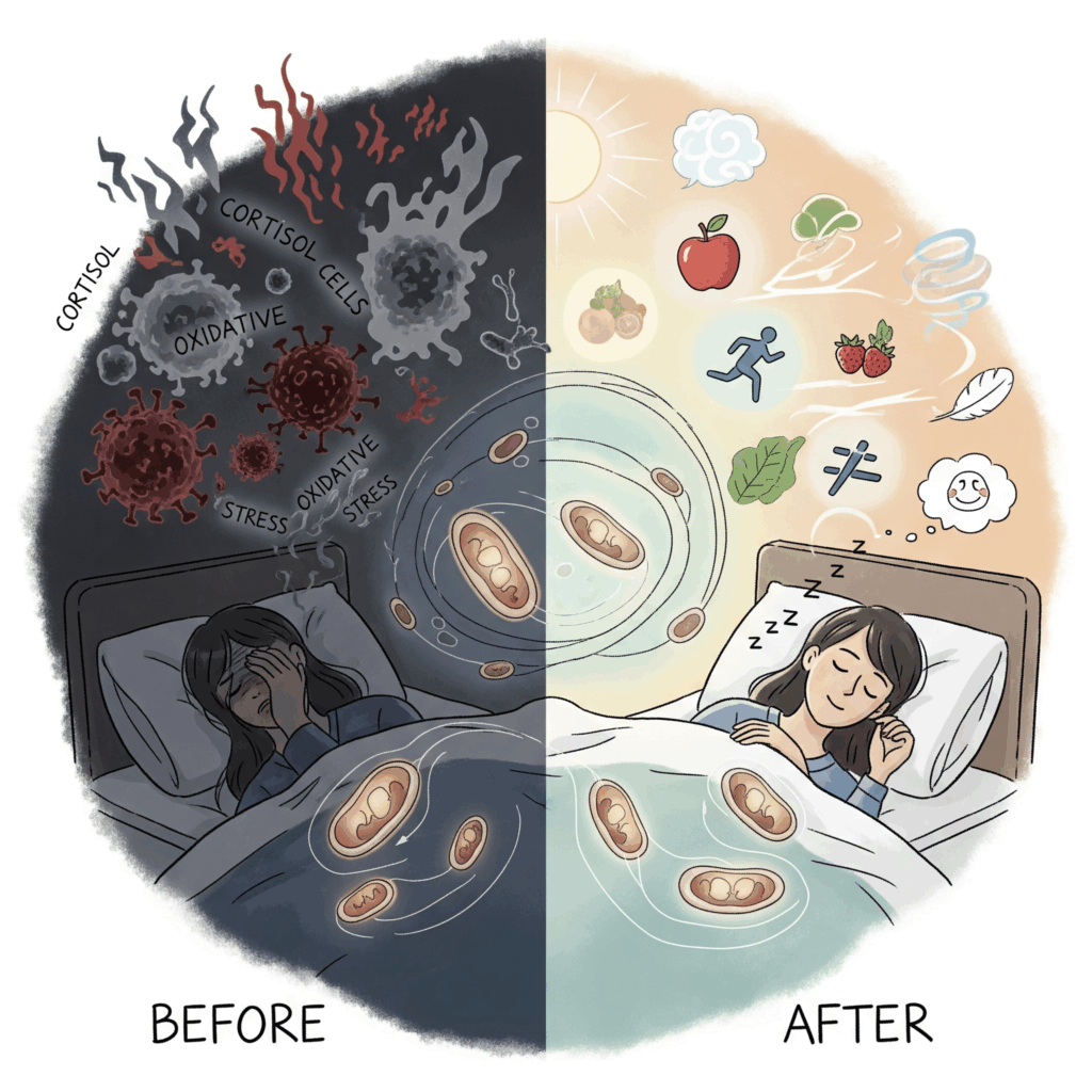 - 不眠・入眠障害の背景には、コルチゾール、ミトコンドリア、炎症、酸化ストレスの相互作用がある。