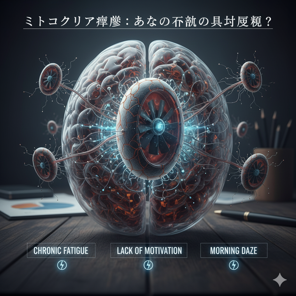 ミトコンドリアは、細胞の中でATP(エネルギー)を生み出す“水力発電所”のような存在です。ところが、活性酸素の攻撃や栄養不足によって機能が低下すると、エネルギーが作れなくなり、体も脳も「動けない」「考えられない」状態に陥ります。