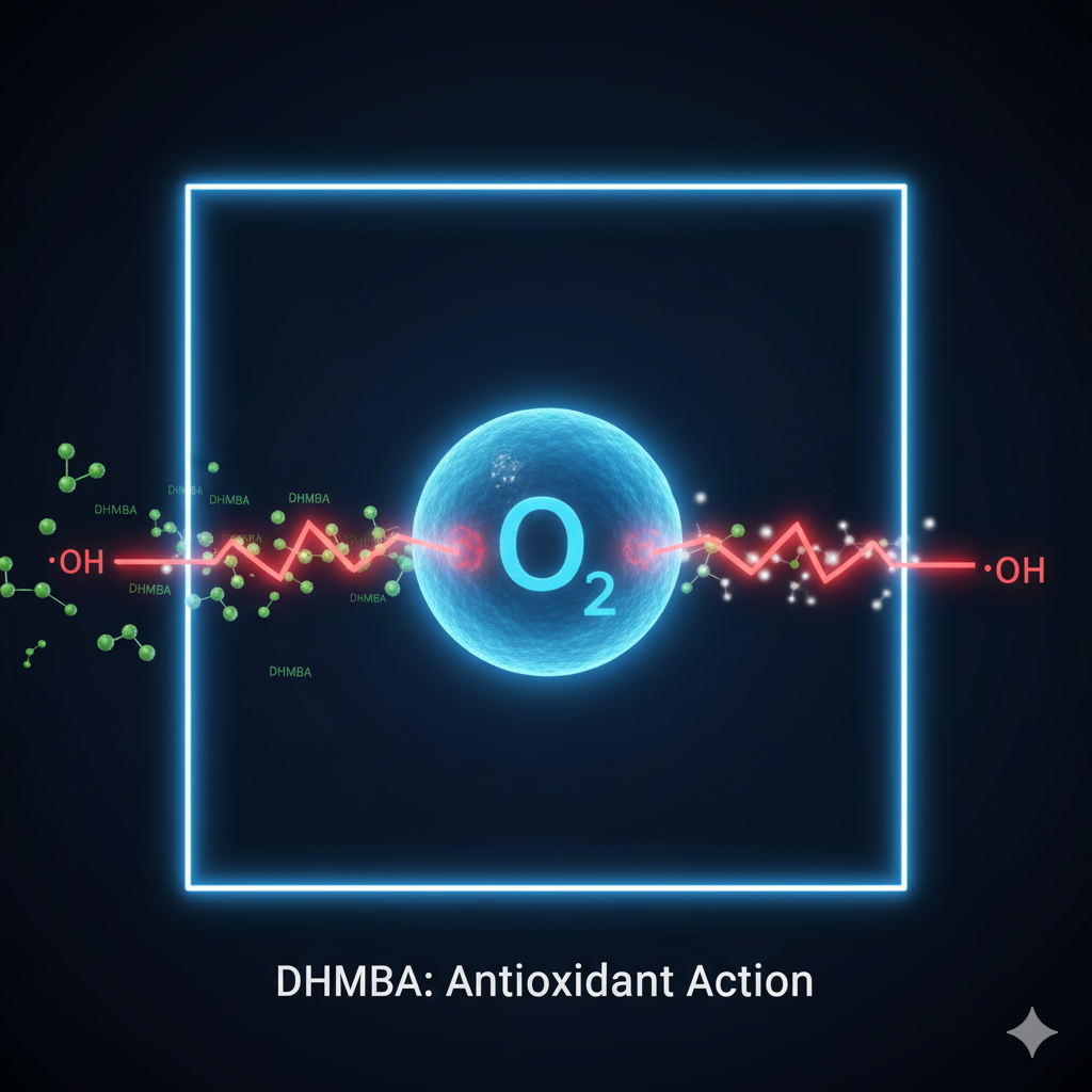 このヒドロキシラジカルを無毒化するために、私たちは「DHMBA(デイエイチエムビイエー)」という物質に注目しました。DHMBAは、ブドウ種子から抽出されるポリフェノールの一種で、高い抗酸化力と炎症抑制力を持つことで知られています。