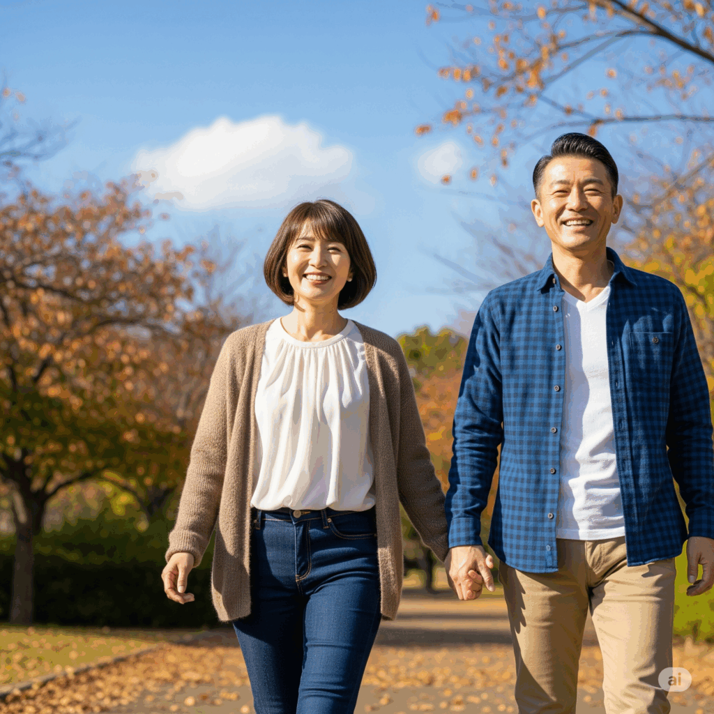 **イラスト提案**: 元気を取り戻した男女が、秋の青空の下で笑顔で歩くイメージ。