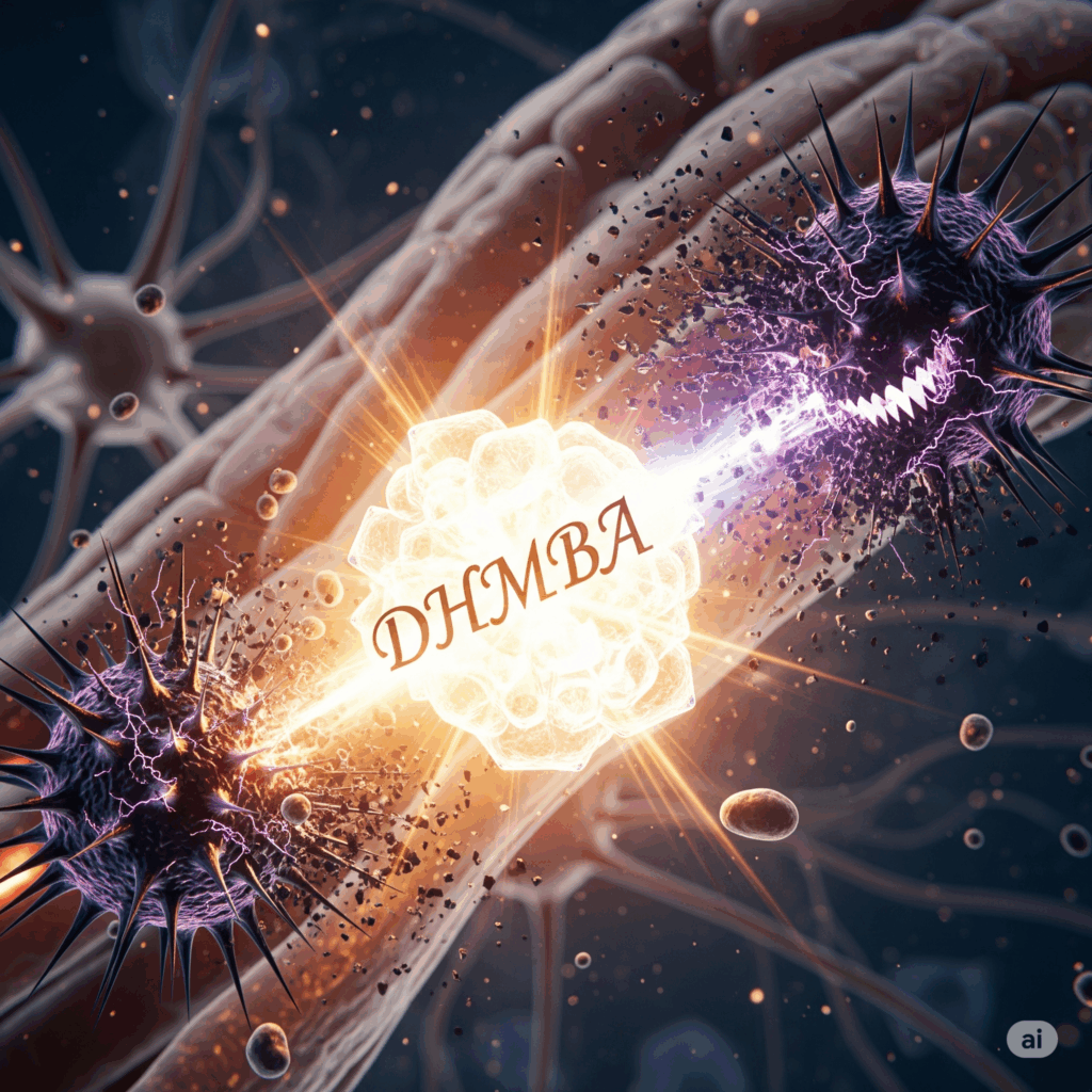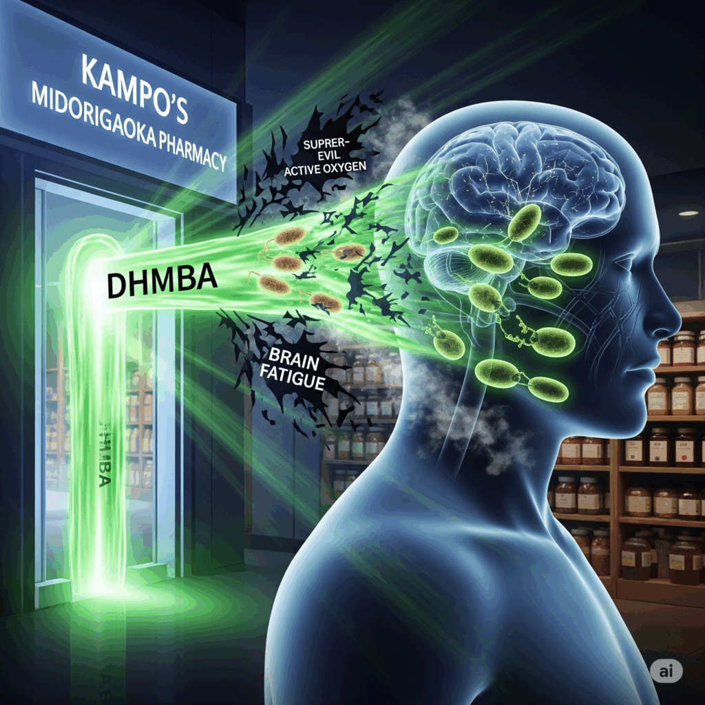 そこで注目されているのが、**【DHMBA(デイエイチエムビイエー)】**という画期的な成分です。DHMBAは、非常に優れた抗酸化作用を持つだけでなく、脳の奥深くまで到達し、他の抗酸化物質が届かないヒドロキシラジカルを強力に無毒化することが期待されています。これにより、脳細胞の酸化ストレスを軽減し、脳疲労・脳過労の根本原因にアプローチ。まさに、夏に蓄積したダメージをリセットし、元気を取り戻すための「奇跡の物質」と言えるでしょう。