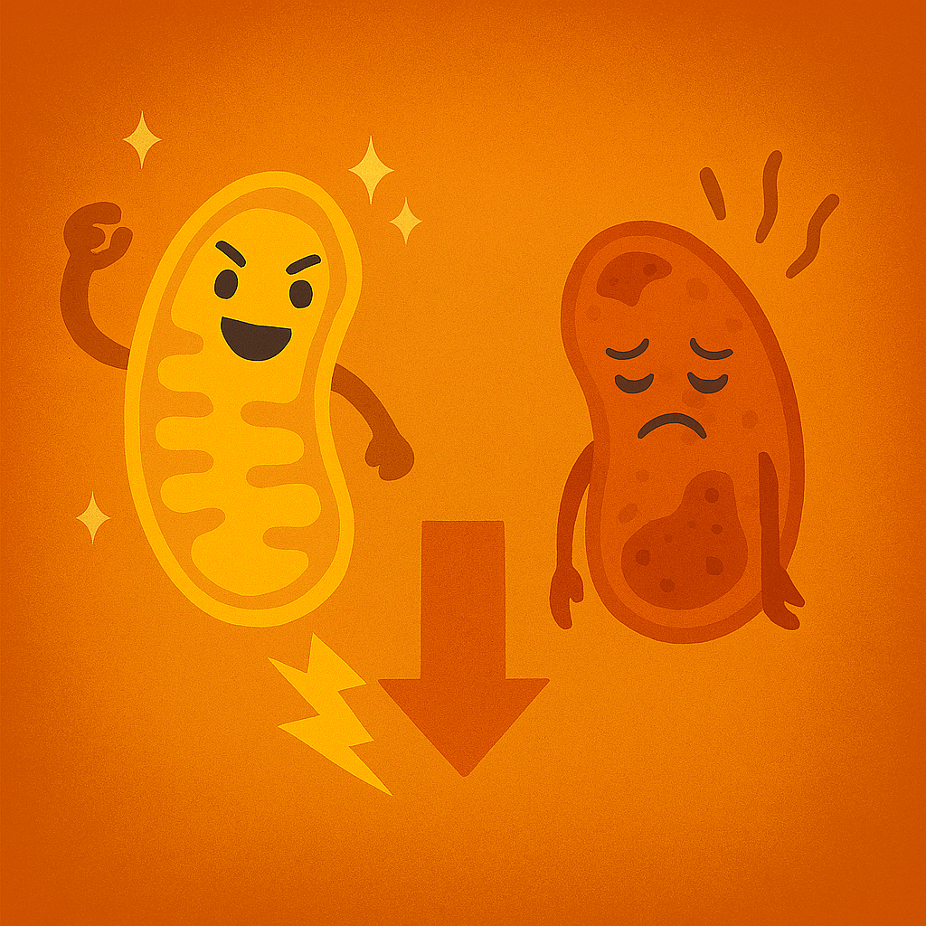 糖尿病患者では、高血糖によってミトコンドリアの機能が損傷を受けやすく、ATP(エネルギー)産生能力が低下します。これにより腎臓細胞は慢性的なエネルギー不足状態となり、修復機能や解毒機能が衰えていきます。ミトコンドリアの活性化は、腎臓の健康維持に欠かせない要素です。