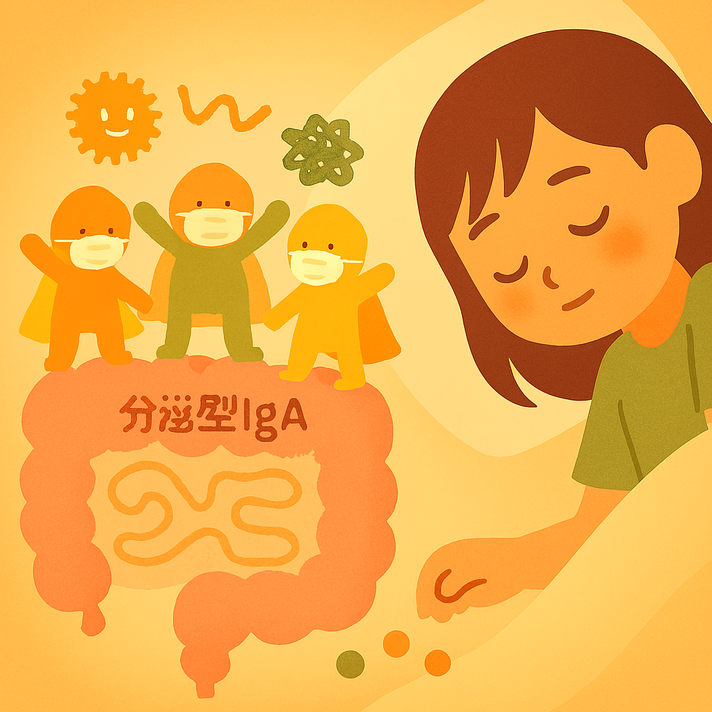 分泌型IgAは、腸の表面で外からのウイルスや細菌、有害物質をキャッチし、体を守ってくれる「見えないバリア」のような存在です。