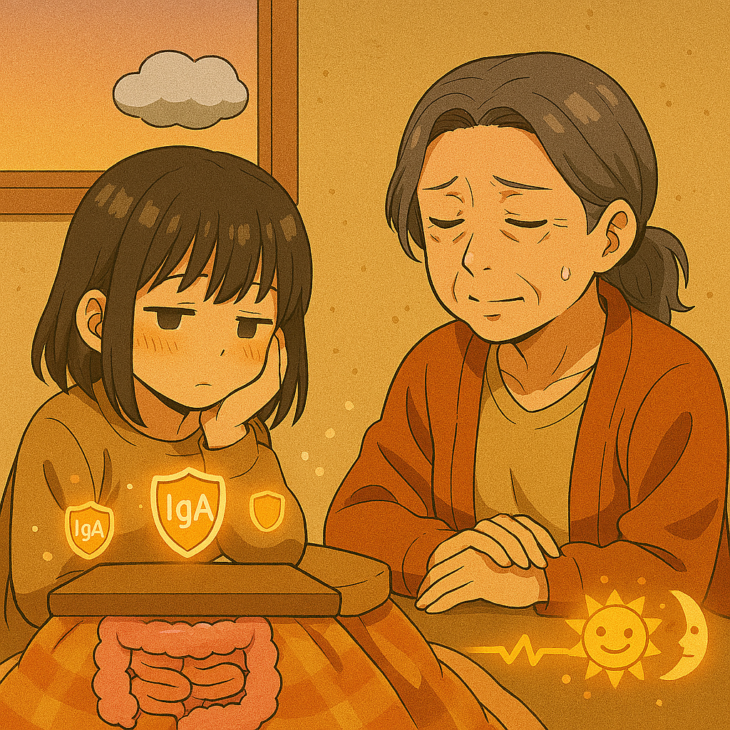 腸は免疫の70%を担います。分泌型IgAが少ないと、ウイルスやストレスに弱くなります。冬場こそ、腸内環境を整え、分泌型IgAを活性化する栄養素(発酵食品・乳酸菌・ビタミンA・亜鉛・グルタミン)を意識しましょう。