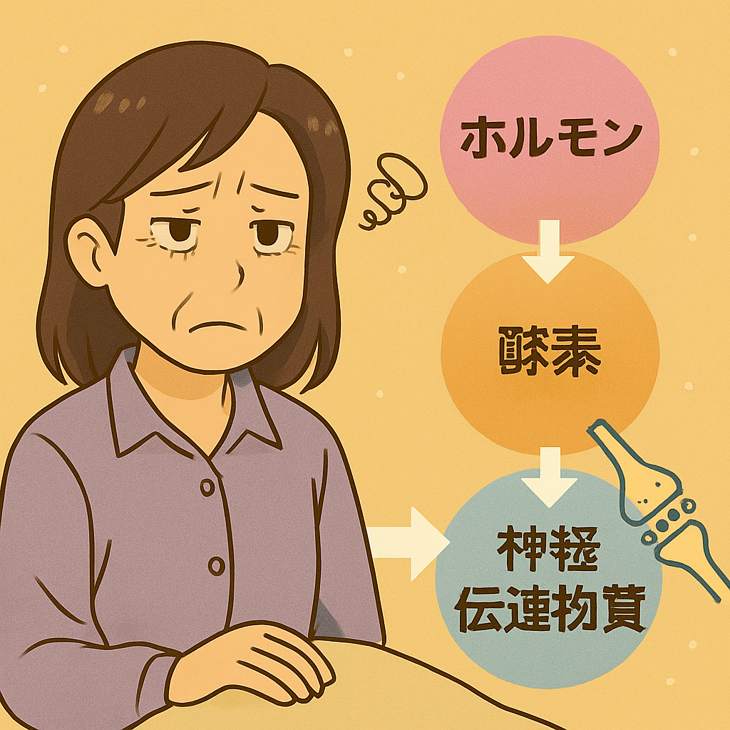 酵素の働きが鈍ると、ホルモンも神経伝達物質も不足。気分の浮き沈みや集中力の低下を引き起こします。バランスを支える栄養の補給がカギ。