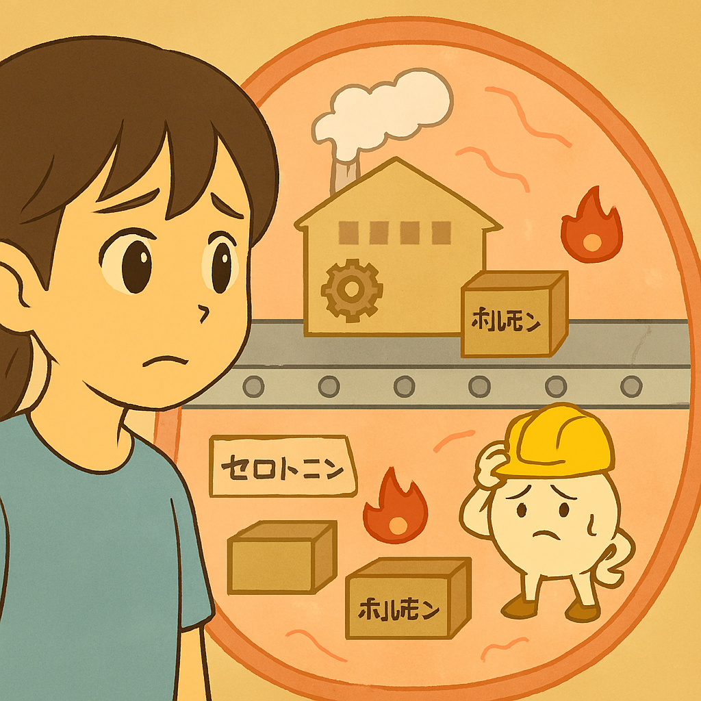 タンパク合成酵素の働きが落ちると、ホルモン・酵素・神経伝達物質を十分に作れなくなり、セロトニンやドーパミンといった「心の安定」に関わる物質も不足しやすくなります。