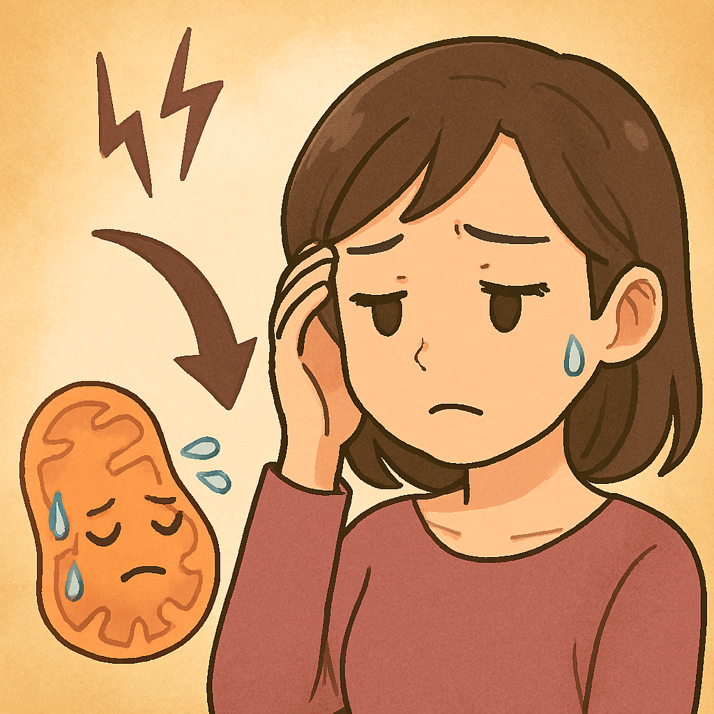 ストレスが続くと、コルチゾールが増加し、エネルギーの発電所・ミトコンドリアが疲弊。ATP(細胞の燃料)が作れず“やる気が出ない”状態に。