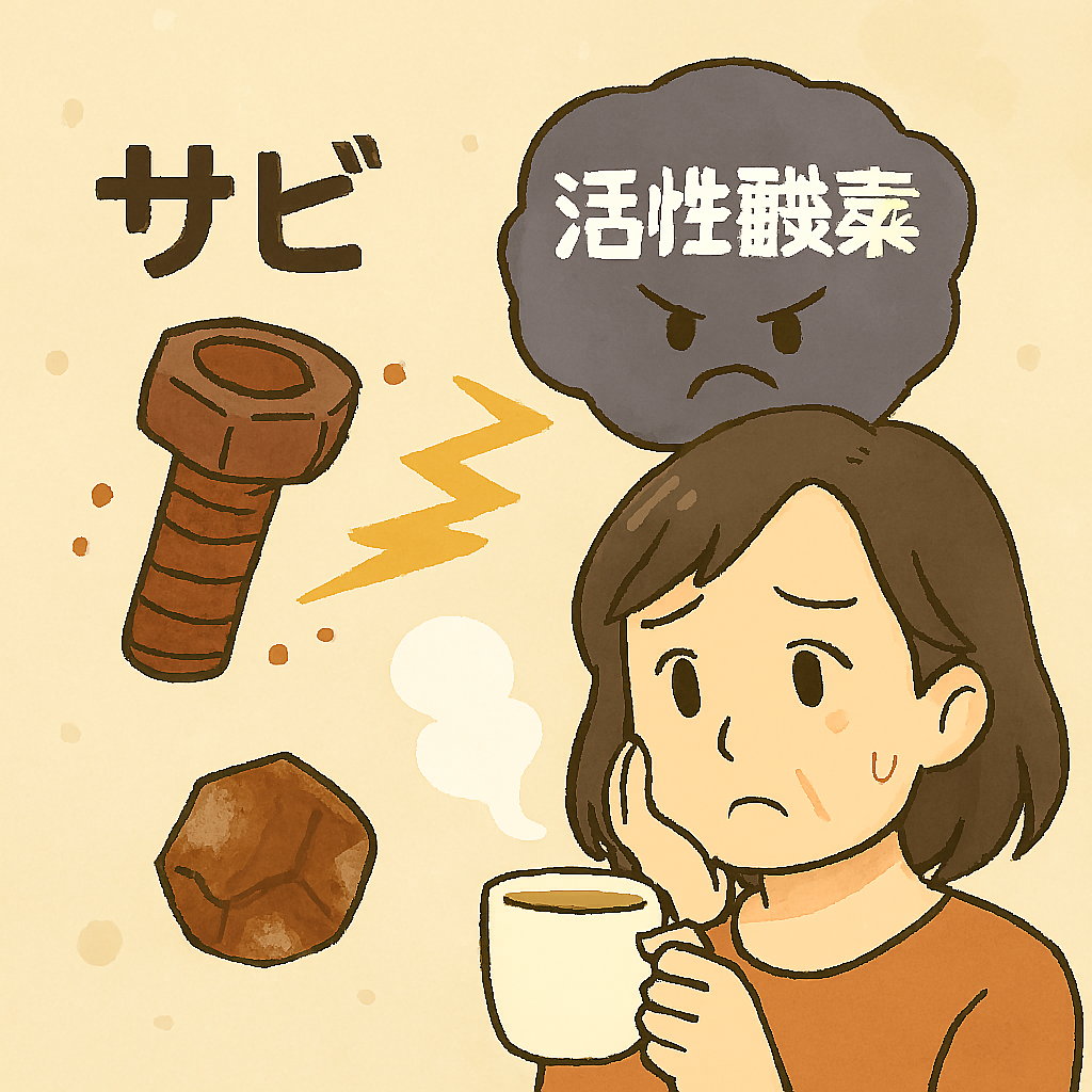 「ヒドロキシラジカル」は活性酸素の中でも最強の酸化力をもつ存在。過剰に発生すると神経細胞を傷つけ、脳疲労を悪化させます。体は抗酸化酵素で守っていますが、加齢で働きが弱まります。