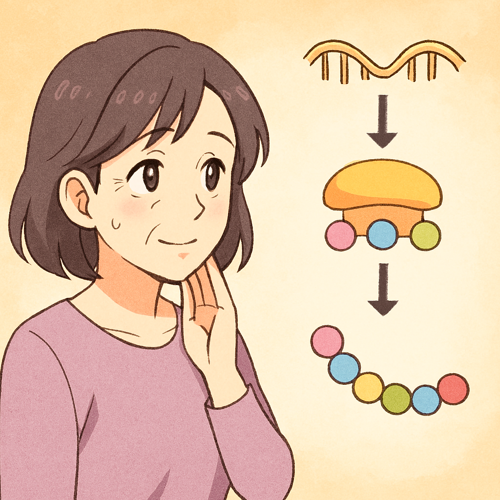 加齢やストレスでタンパク合成が落ちるとホルモンや神経伝達物質が不足しやすくなります。良質なたんぱく・睡眠・漢方での補助を考えます。