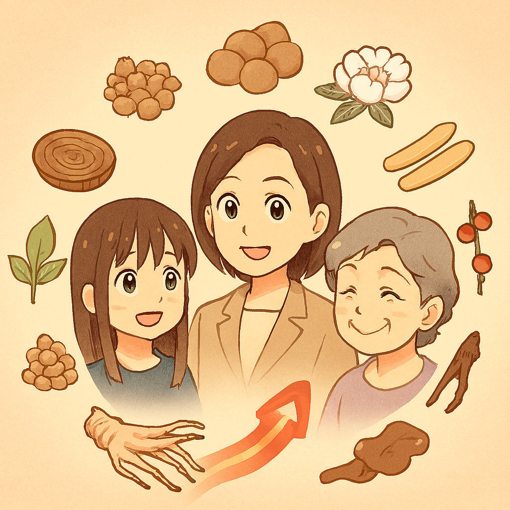 当帰に加え、阿膠で潤い、黄耆で元気、党参などで消化吸収を助ける。血・気・潤いのバランスを整え、内側から健康と美しさを引き出します。
