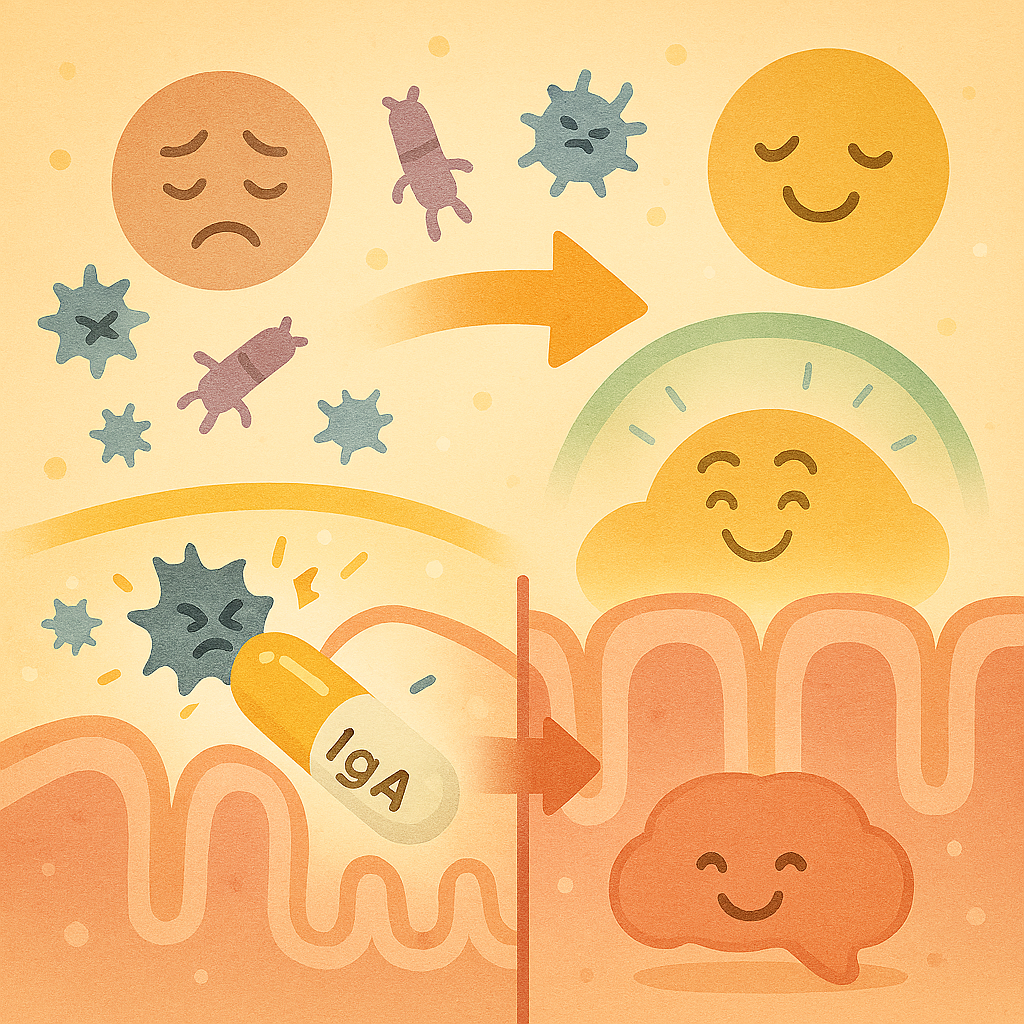 分泌型IgAは、腸管の粘膜表面に分泌される免疫グロブリンで、外から入ってくるウイルスや細菌をブロックする「第一線の防御役」です。