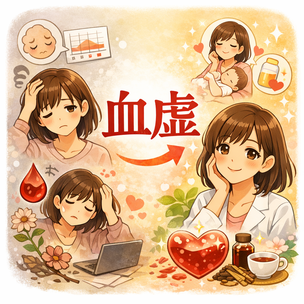 西洋医学でいう「貧血」は、血液中のヘモグロビン濃度などが低い状態を指し、主に鉄剤で治療します。一方、中医学の「血虚(けっきょ)」はもっと広い意味を持ちます。