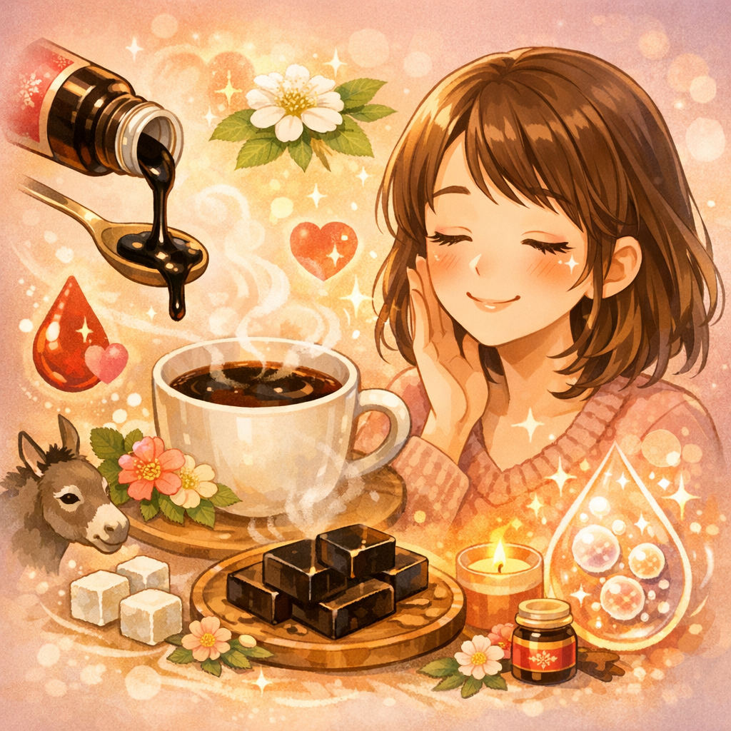 婦宝当帰膠には「阿膠(アキョウ)」という生薬も配合されています。これはロバの皮を煮込んで作られる膠(にかわ)で、天然のコラーゲンがたっぷり含まれています。
